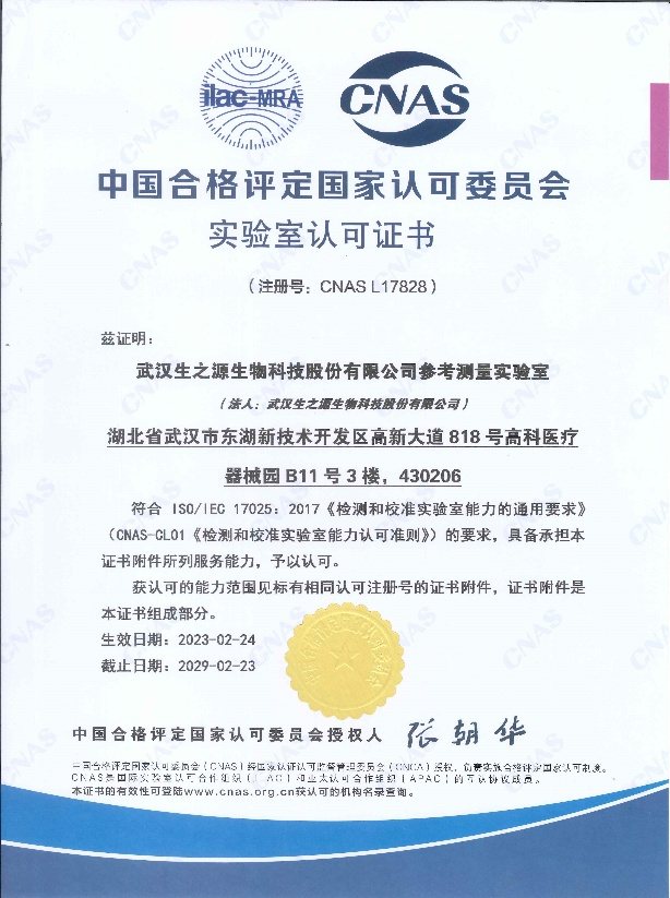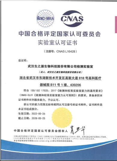 武漢生之源檢測實驗室于2022年5月26日通過CNAS檢測實驗室認可(注冊號:CNAS L16428),武漢生之源參考測量實驗室于2023年2月24日通過CNAS參考測量實驗室認可(注冊號:CNAS L17828)